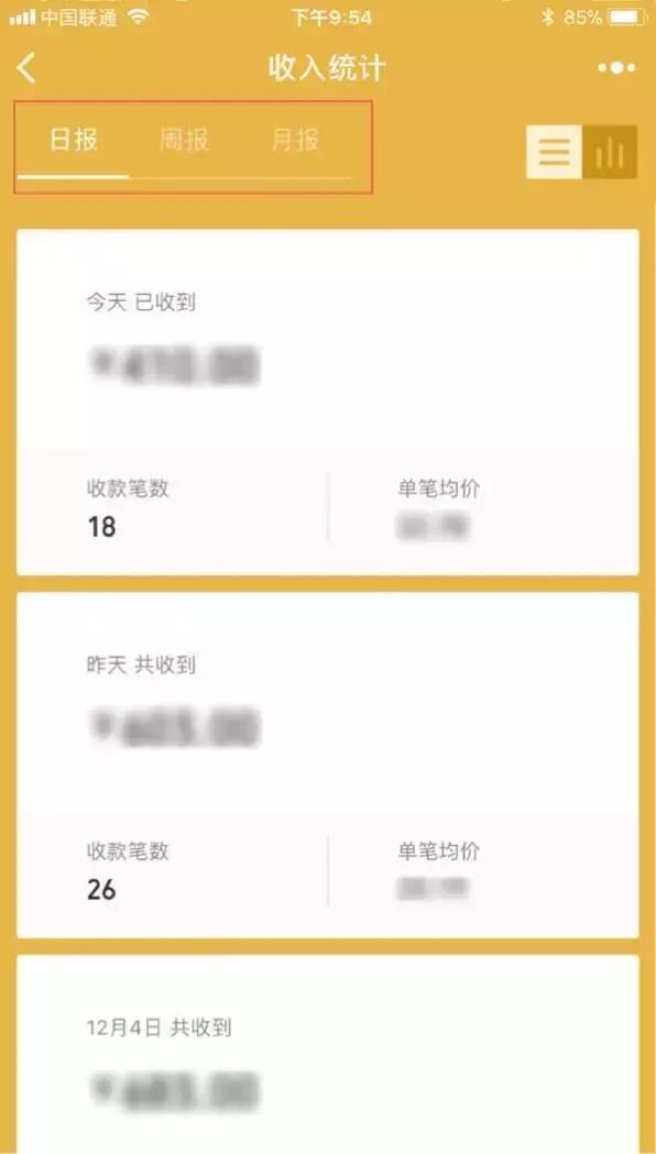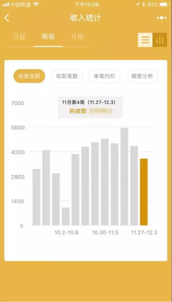 收入统计:提供日报、周报、月报详细记录查询,让每笔收入,收款金额、收款笔数、单笔均价、新老顾客分析等数据一目了然。
