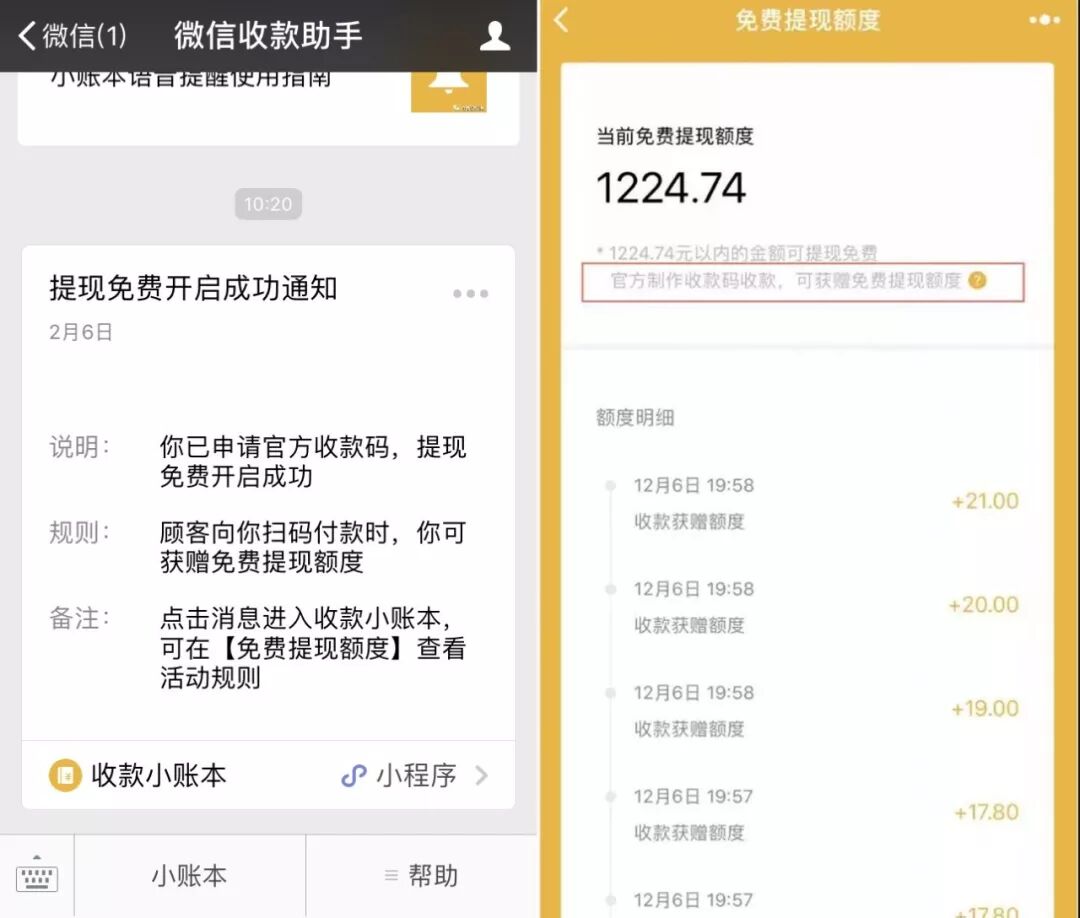 即日起至2018年12月31日,商户使用“官方收款码”进行收款,还可累加免费提现额度。同一身份证号码下所有微信支付账号的免费提现额度将累计计算,每年最高可获赠1,000,000元(壹百万)免费提现额度,每日最高可获赠10,000元(壹万元)免费提现额度,每笔最高可获赠500元(伍佰元)免费提现额度。